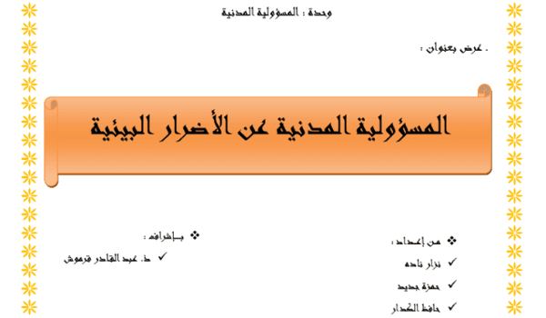 المسؤولية المدنية عن الأضرار البيئية PDF ماستر منازعات الأعمالعرض تحت عنوان : المسؤولية المدنية عن الأضرار البيئية من إعداد الطلبة : - نزار ناده- حمزة جديد - حافظ الكدار تحت إشراف الدكتور : عبدالقادر قرموشالسنة الجامعية : 2019 : 2020رابط التحميل بصيغة PDF _____________